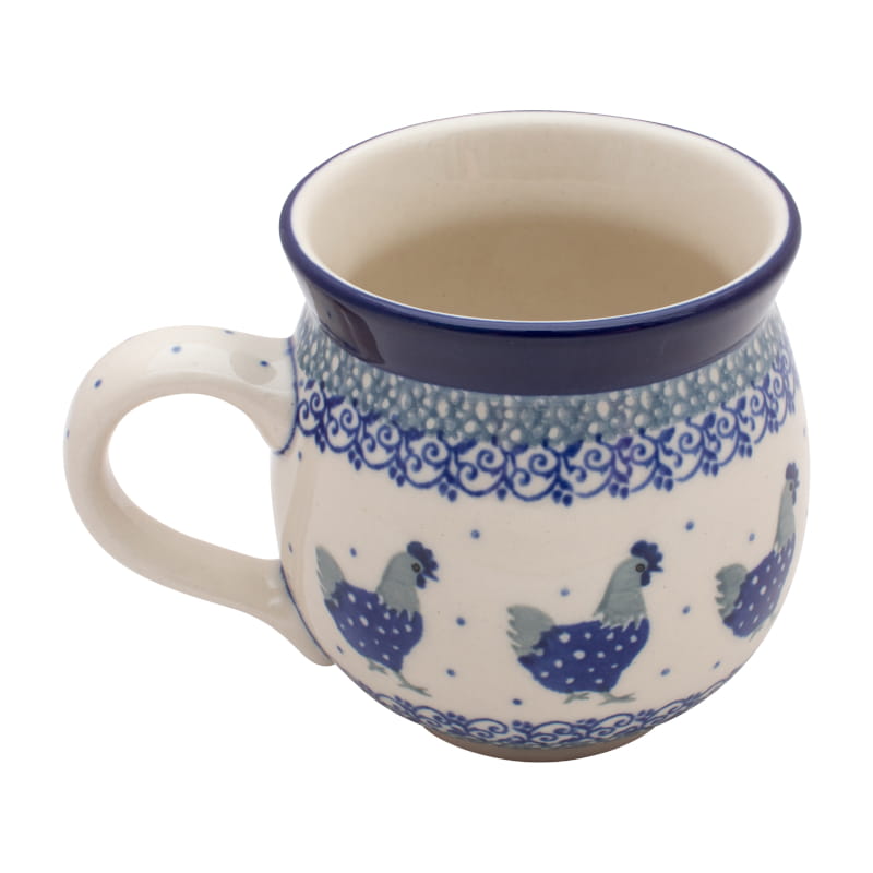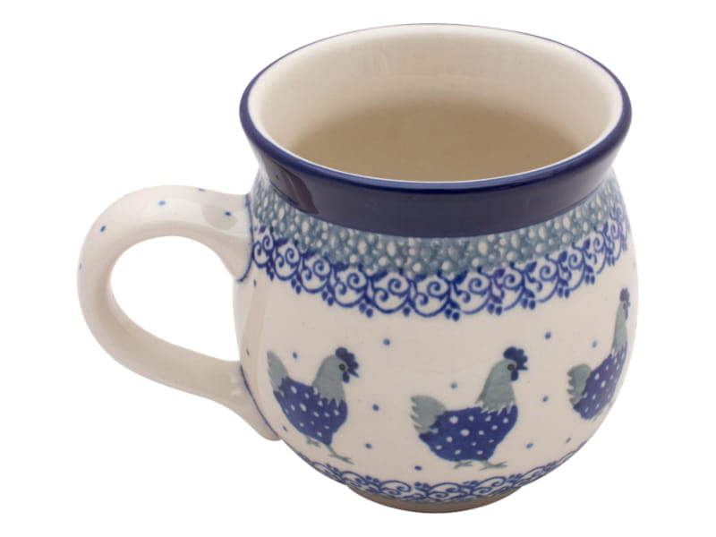 Wzór z kurami. Kura w kolorze granatowym i szarym. Wykończenie obrzeża w kolorze granatowym. Ceramika Bolesławiec - Handmade.