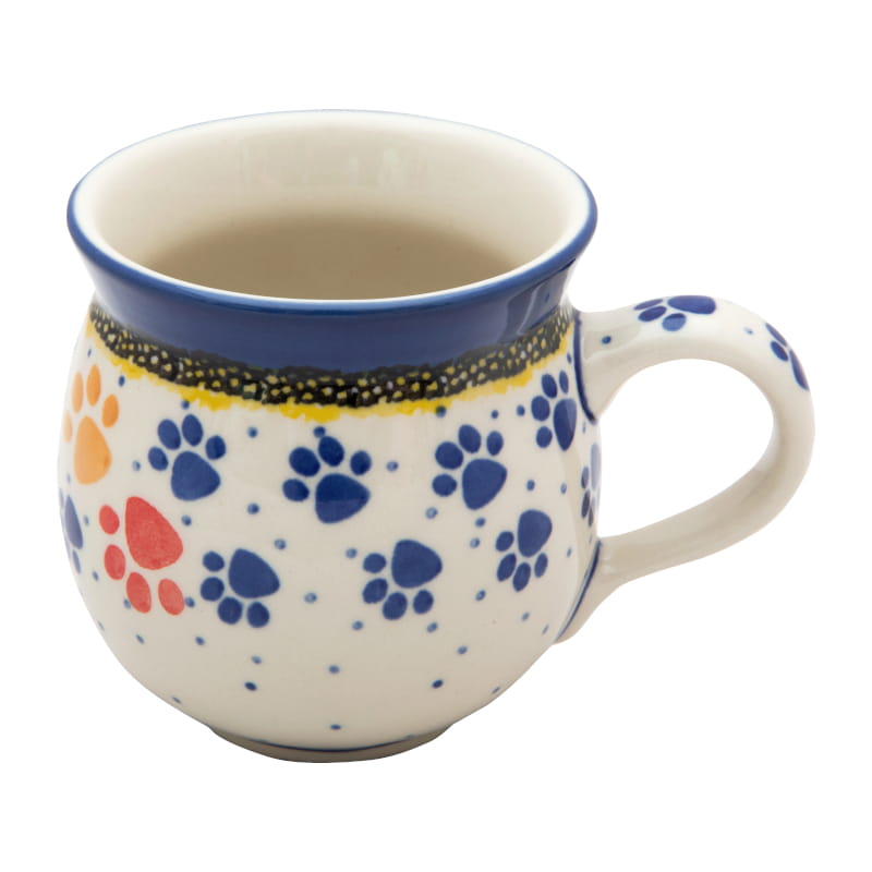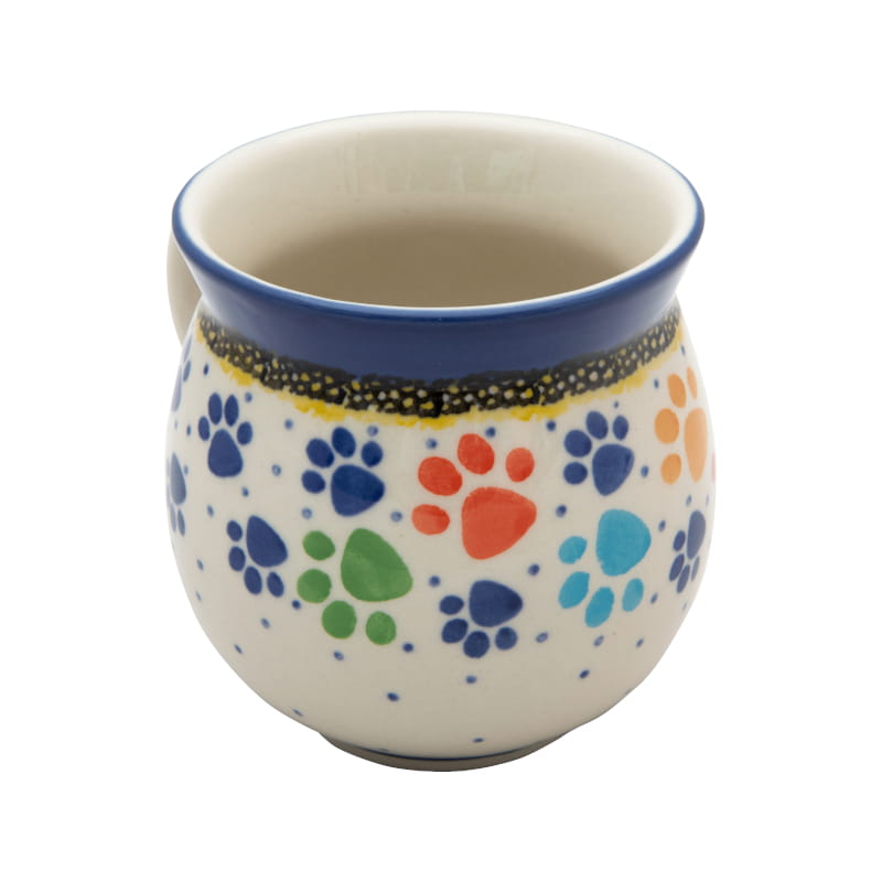 Wzór w różnokolorowe łapki zwierząt. Wykończenie obrzeża w kolorze granatowym. Ceramika Bolesławiec - Handmade.