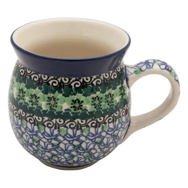 Oryginalna Ceramika Bolesławiec zdobiona ręcznie za pomocą stempli z gąbki morskiej i pędzelków, farby ekologiczne.