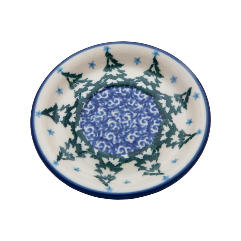 Dekoracja RENIFERY Bolesławiec. Wzór świąteczny z jeleniami i zimowym krajobrazem w lesie. Choinki, świerki, gwiaździste niebo, śnieg. Wykończenie obrzeża w kolorze granatowym. Ceramika Bolesławiec - HANDMADE.