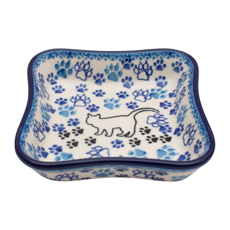 Wzór z kotem. Wokół ślady łap w odcieniach niebieskiego i czarnym. Wykończenie obrzeża w kolorze granatowym z motywem kotów. Ceramika Bolesławiec - Handmade.