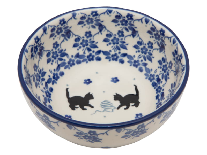 Wzór z kotami w odcieniach niebieskiego i czarnym. Kotki bawiące się kłębkiem wełny w otoczeniu roślinnych wzorów. Wykończenie obrzeża w kolorze granatowym. Ceramika Bolesławiec - Handmade.