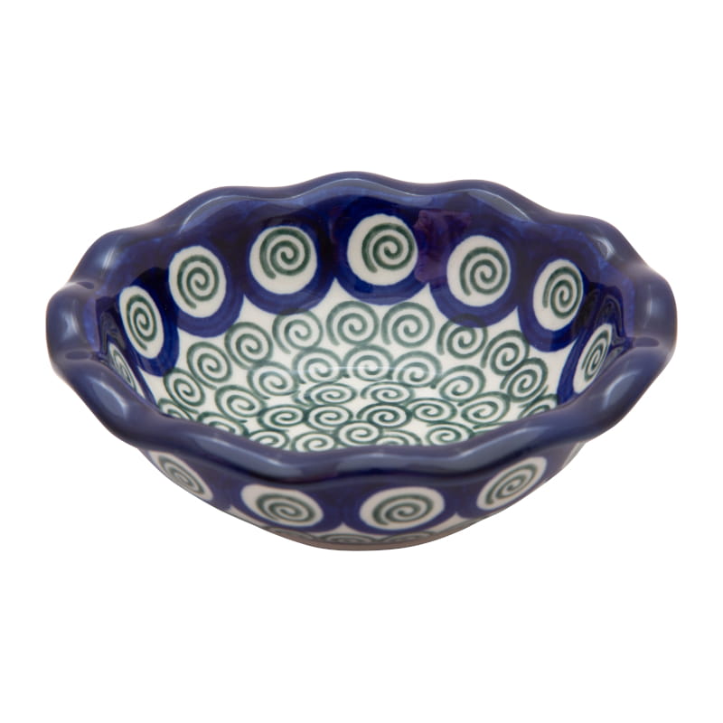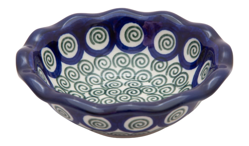 Ceramika Bolesławiec - HANDMADE. Wzór KLASYCZNY - spirale w kolorze zielonym. Wykończenie obrzeża w kolorze granatowym.
