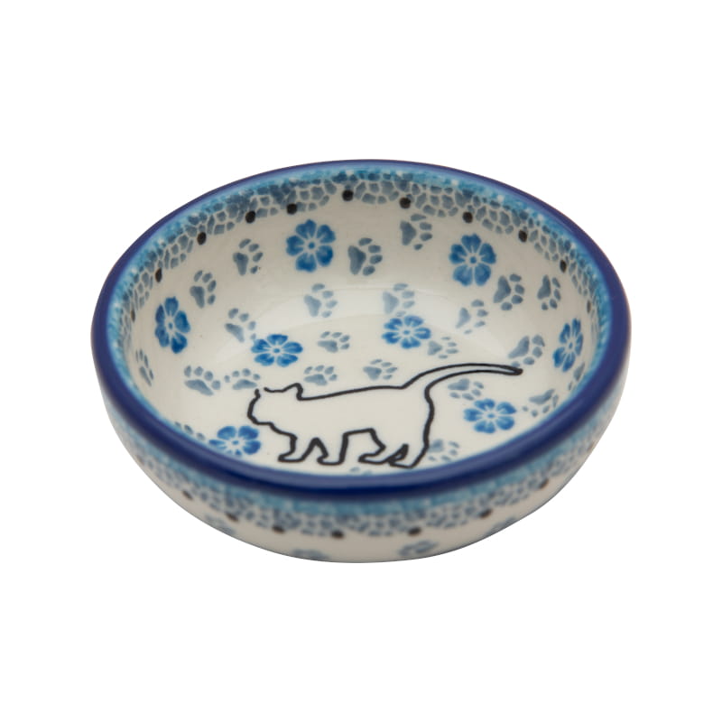 Ceramika Bolesławiec - HANDMADE. Wzór z Kotkami. Wykończenie obrzeża w kolorze granatowym.
