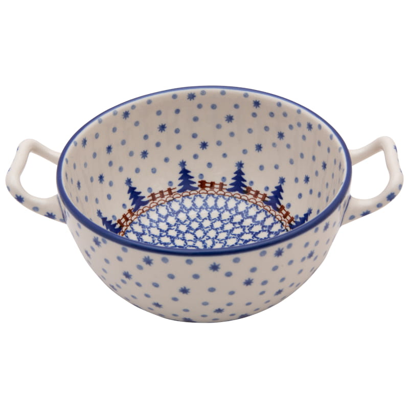 Choinki na Boże Narodzenie. Wzór świąteczny w stylu vintage w kolorach błękitu i brązu z choinką, gwiazdkami i śniegiem. Wykończenie obrzeża w kolorze granatowym. Ceramika Bolesławiec - HANDMADE.