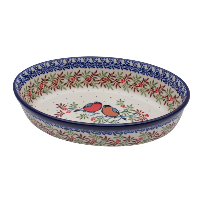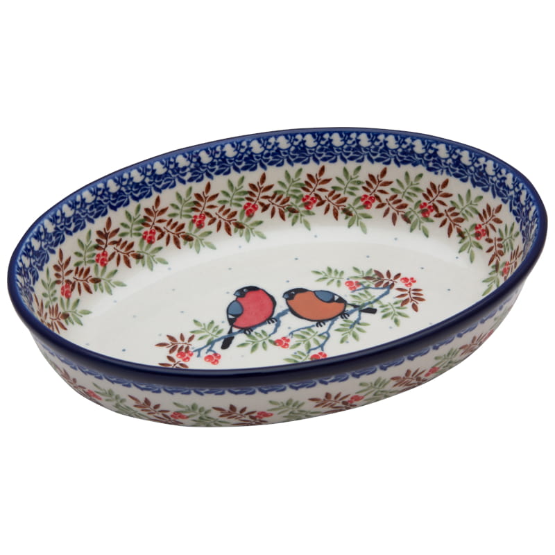 Wzór Unikatowy. Ptaki Gile na gałęzi w kolorach jesieni. Liście i owoce jarzębiny. Wykończenie obrzeża w kolorze granatowym. Ceramika Bolesławiec - HANDMADE.