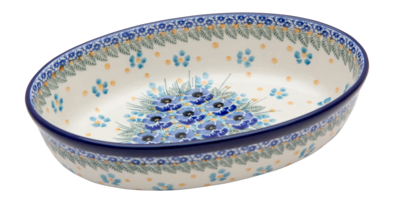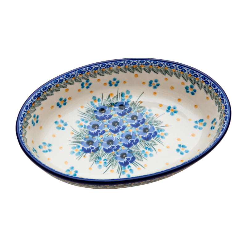 Ceramika Bolesławiec - HANDMADE. Wzór KWIATOWY - bratki w kolorach niebieskim i granatowym. Wykończenie obrzeża w kolorze granatowym.