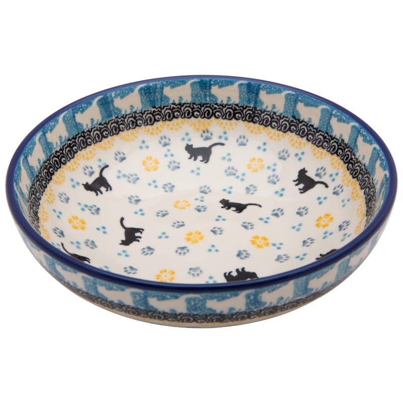 Wzór z kotem. Wokół ślady łap w odcieniach niebieskiego, żółte kwiaty i czarne motywy roślinne. Wykończenie obrzeża w kolorze granatowym z motywem kotów. Ceramika Bolesławiec - Handmade.