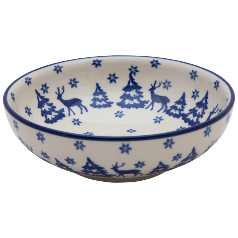 Wzór zimowy w kolorze granatowym. Wzór w płatki śniegu, renifery i choinki. Wykończenie obrzeża w kolorze granatowym. Ceramika Bolesławiec - HANDMADE.