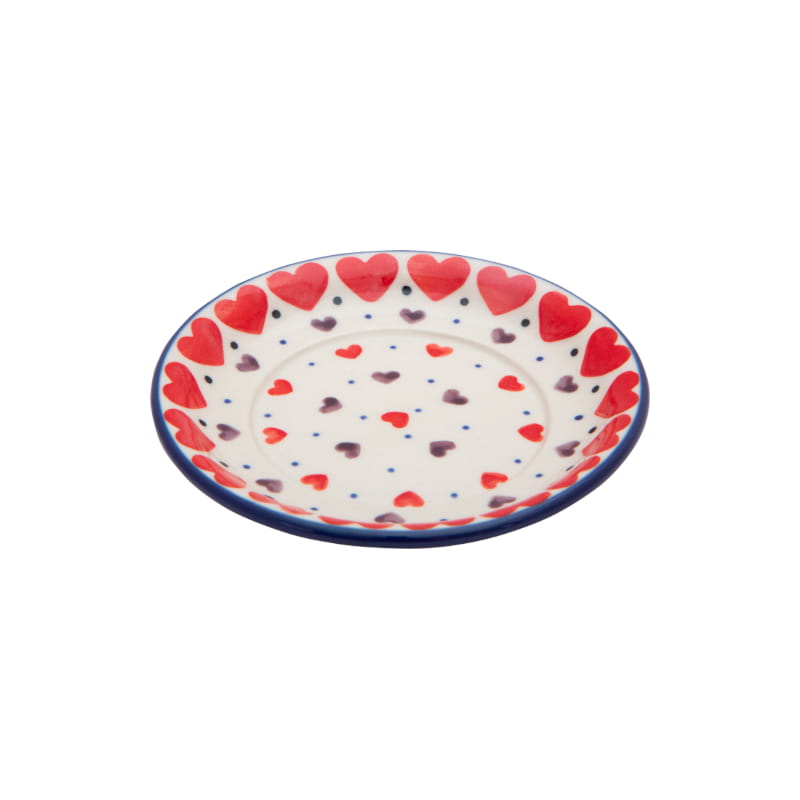 HEART pattern. Red and brown hearts and tiny blue dots. The edge in navy blue. Boleslawiec pottery - handpainted.