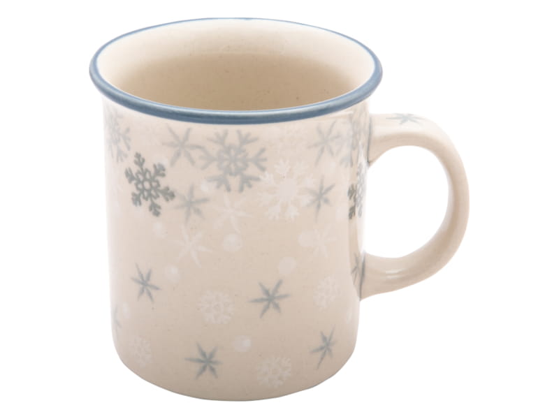 Winter pattern with snowflakes in shades of white and gray. The edge finished in grey-green. Boleslawiec pottery - handpainted.