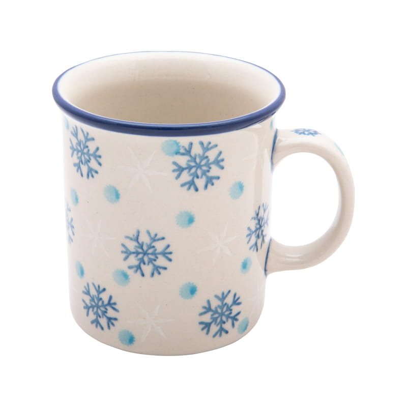 Simple winter pattern. Snowflakes in dark blue and white and light blue spots. The edge in navy blue. Boleslawiec pottery - handpainted.