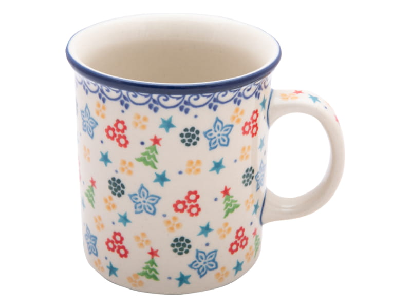 Unique Christmas pattern, multicolored. Pattern with flowers and Christmas trees with a blue plant ornament. The edge in navy blue. Boleslawiec Pottery - Handpainted.