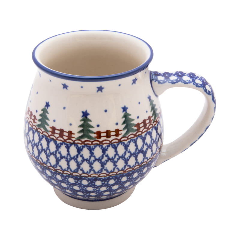 Unique multicolor christmas pattern with Christmas trees, stars, snow and moon. Green and blue ornament on the edges of the pattern. The edge in navy blue. Boleslawiec pottery - handpainted.