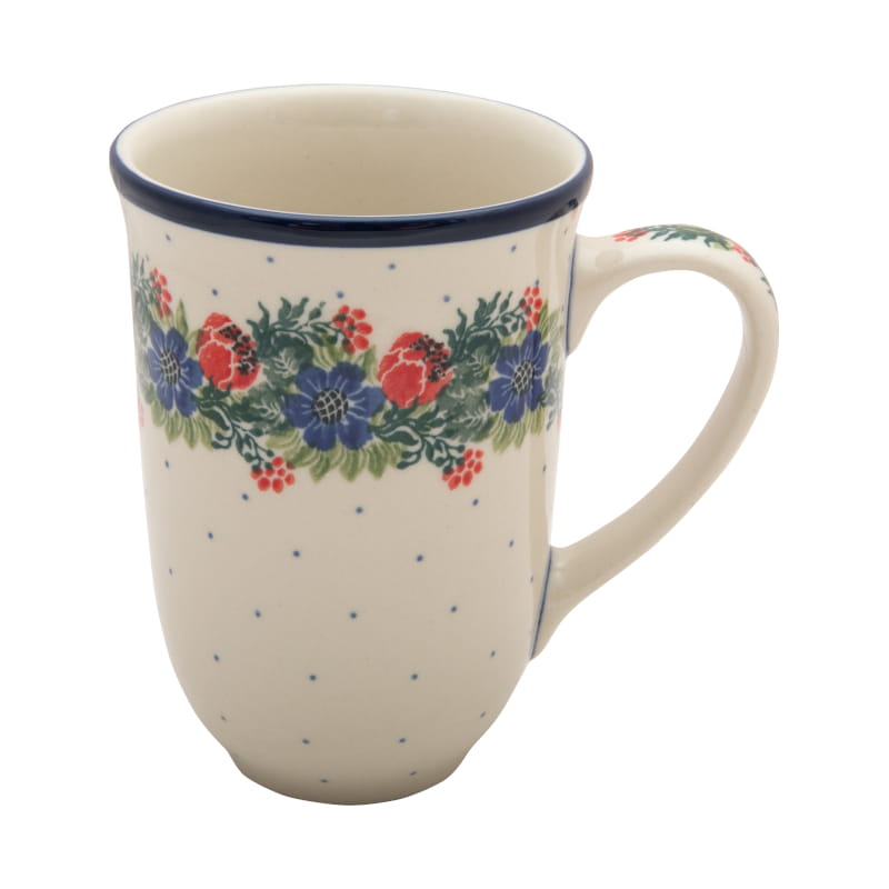 Ceramika Bolesławiec - HANDMADE. Wzór KWIATOWY z kwiatami w kolorach czerwonym i granatowym. Wykończenie obrzeża w kolorze granatowym.
