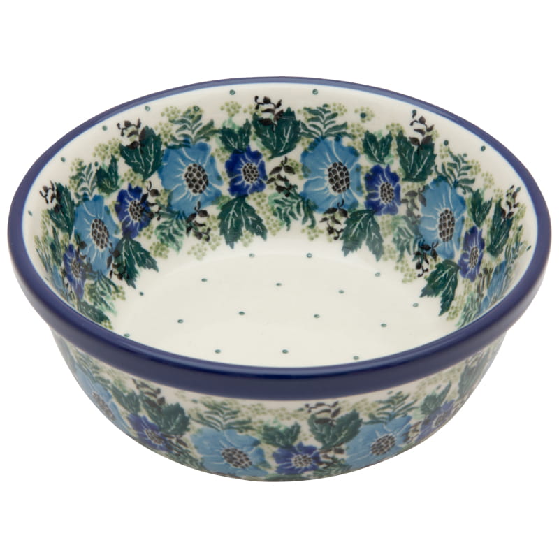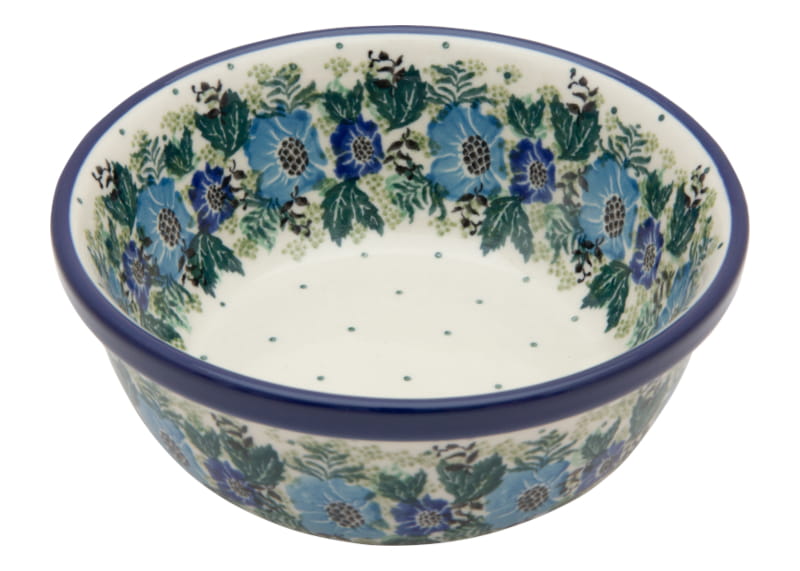Wzór kwiatowy. Kwiaty w kolorach granatowym i jasnoniebieskim, w gąszczu zieleni w wielu odcieniach. Zielone kropki jako uzupełnienie. Wykończenie obrzeża w kolorze granatowym. Ceramika Bolesławiec - Handmade.