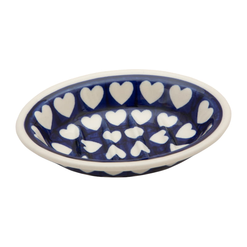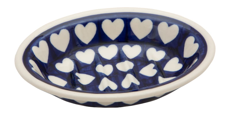 Wzór KLASYCZNY w stylu VINTAGE. Białe serca na granatowym tle. Wykończenie obrzeża w kolorze granatowym. Ceramika Bolesławiec - HANDMADE.