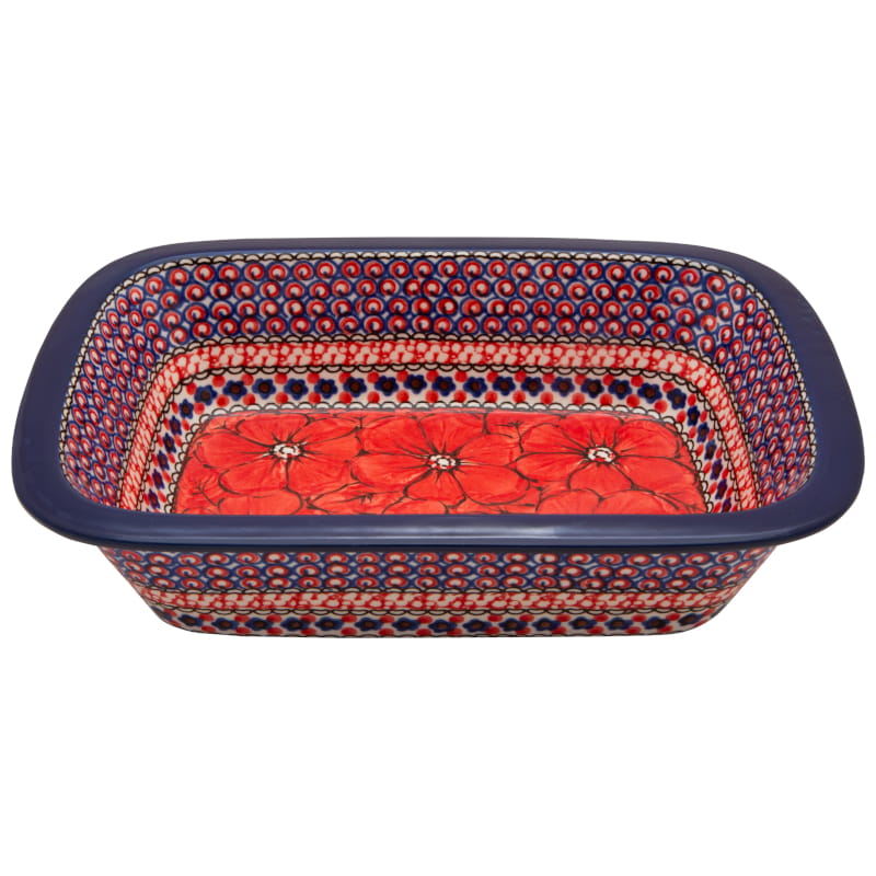 Wzór UNIKATOWY z kwiatami w kolorze czerwonym. Kwiatowy granatowo-czerwony motyw wokół. Wykończenie obrzeża w kolorze granatowym. Ceramika Bolesławiec - HANDMADE.