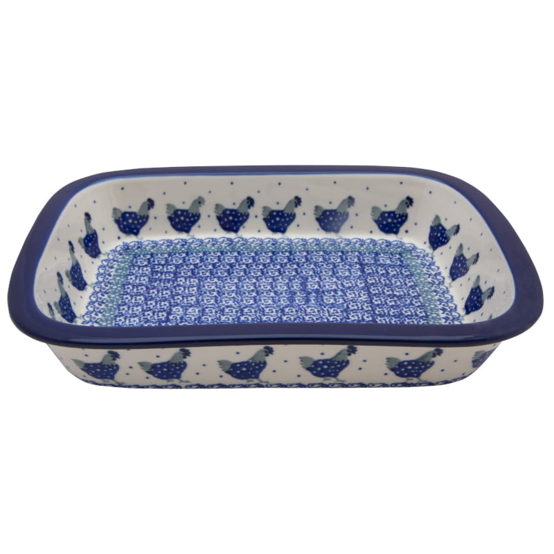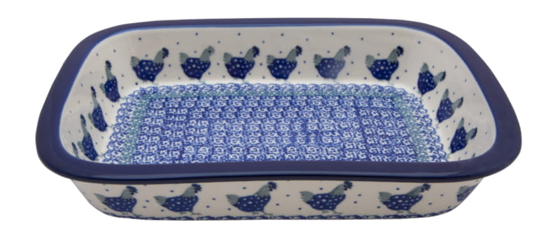Wzór z kurami. Kura w kolorze granatowym i szarym. Wykończenie obrzeża w kolorze granatowym. Ceramika Bolesławiec - Handmade.