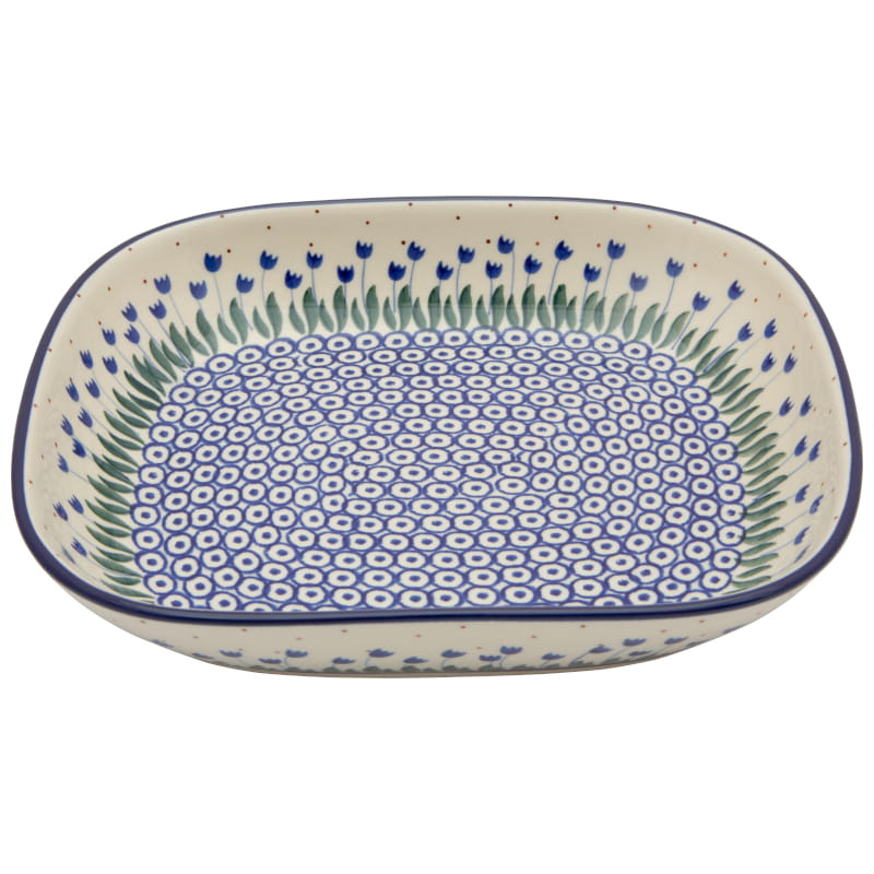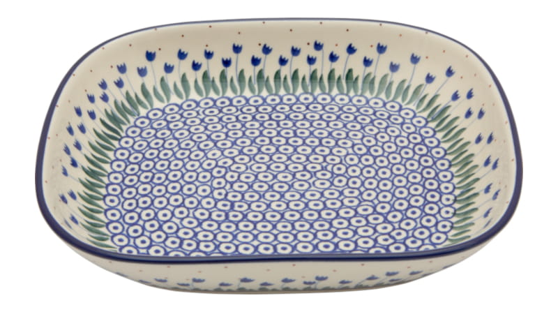 Wzór klasyczny z motywami roślinnymi (tulipany) w kolorach granatowym i zielonym. Wykończenie obrzeża w kolorze granatowym. Ceramika Bolesławiec - HANDMADE.