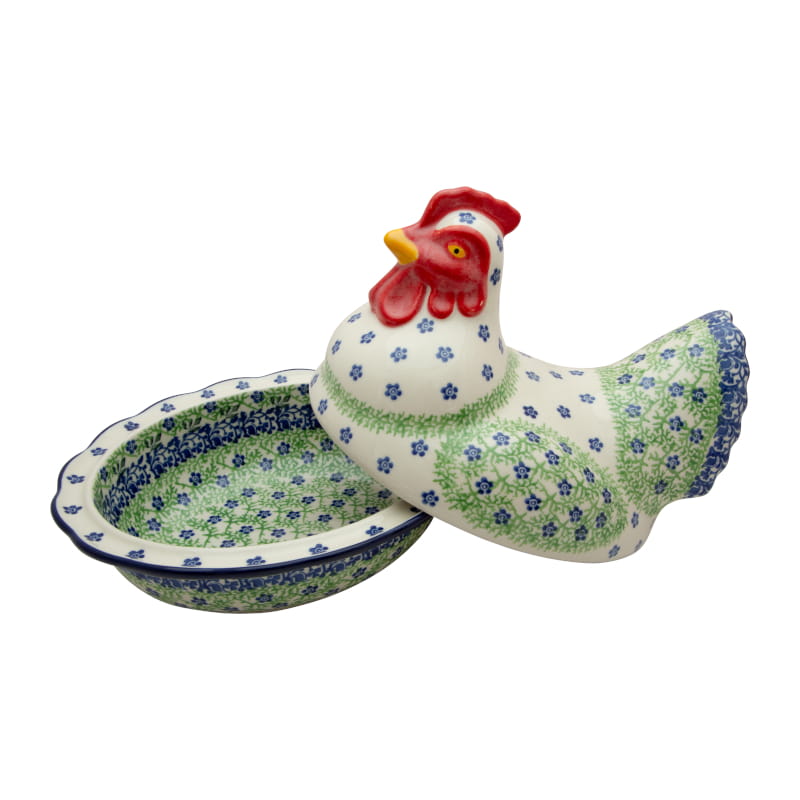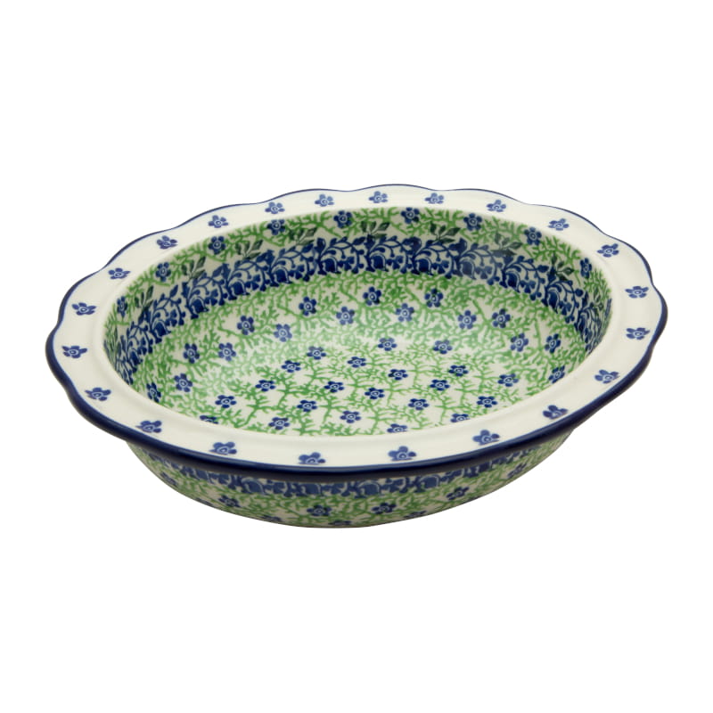 Klasyczny wzór kwiatowy z granatowymi kwiatami na zielonym tle. Wykończenie obrzeża w kolorze granatowym. Ceramika Bolesławiec - HANDMADE.