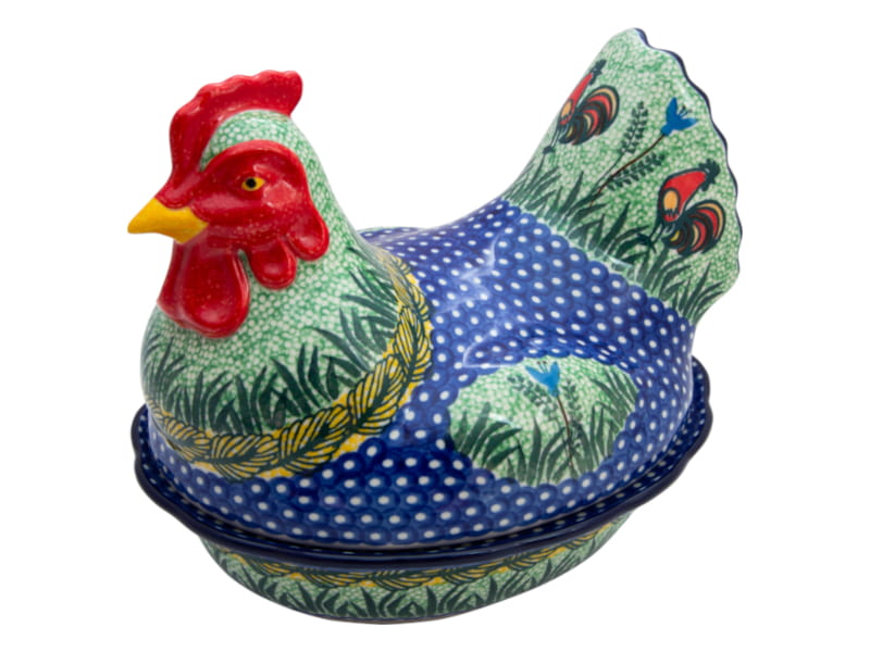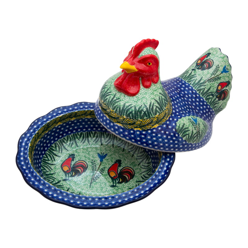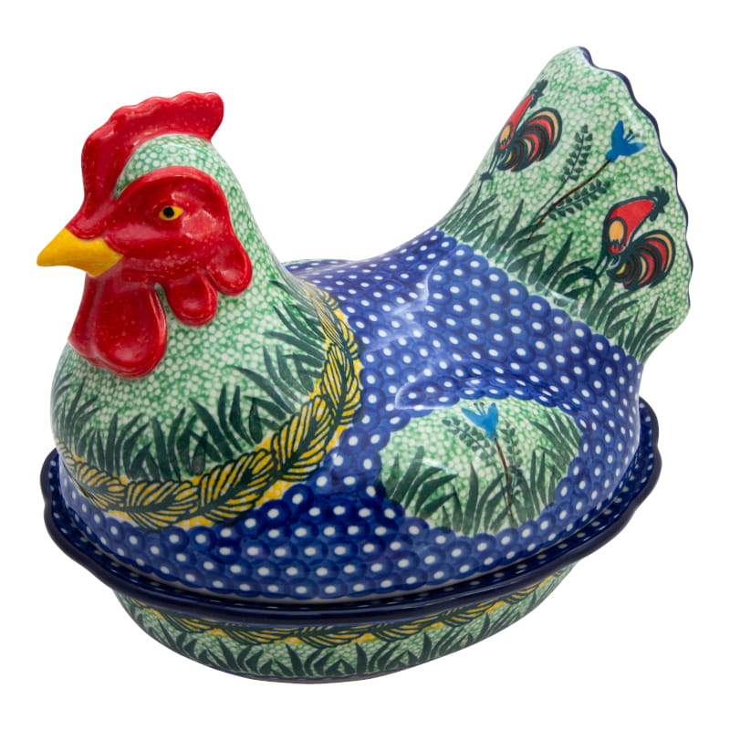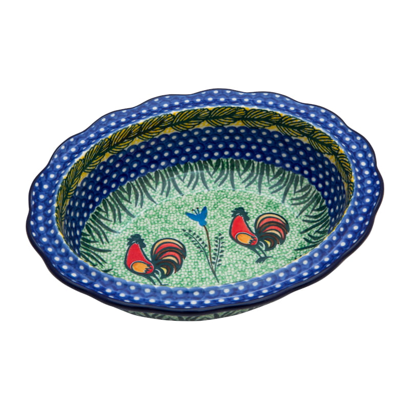 Wzór UNIKATOWY, zwierzęcy. Czerwony i żółty kogut i roślinny wzór z niebieskim dzwonkiem pomiędzy. Ornament w kolorach czarnym, zielonym i niebieskim. Wykończenie obrzeża w kolorze granatowym. Ceramika Bolesławiec - HANDMADE.
