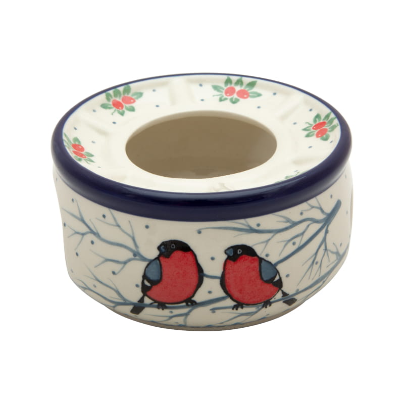 Wzór Unikatowy - ptak Gil w kolorze czerwonym. Ptaki Gile na gałęzi w kolorach jesieni. Liście i owoce golterii. Wykończenie obrzeża w kolorze granatowym. Ceramika Bolesławiec - HANDMADE.