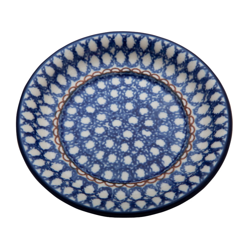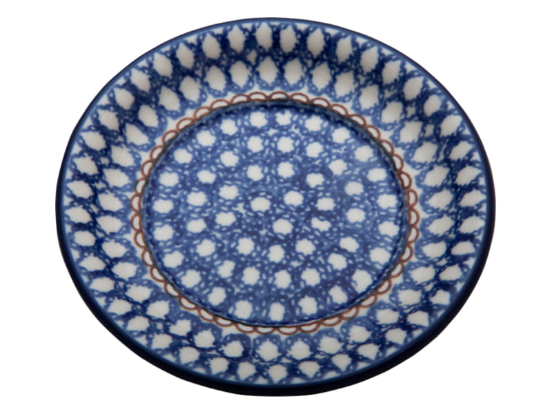 Wzór świąteczny w stylu vintage w kolorach błękitu. Geometryczny wzór kółka i brązowy płot. Wykończenie obrzeża w kolorze granatowym. Ceramika Bolesławiec - HANDMADE.