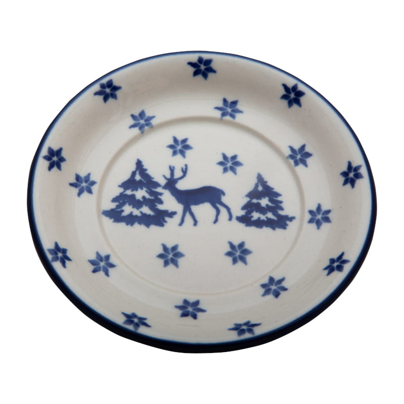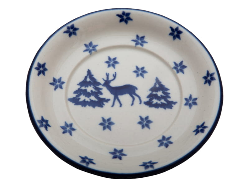 Dekoracja zimowa w kolorze granatowym. Wzór w płatki śniegu, renifery i choinki. Przykrywka może być podstawką pod kubkiem. Ceramika Bolesławiec - HANDMADE. Wykończenie obrzeża w kolorze granatowym.