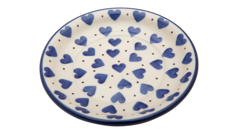 Ceramika Bolesławiec - HANDMADE. Wzór klasyczny. Serca w kolorze granatowym. Wykończenie obrzeża w kolorze granatowym.