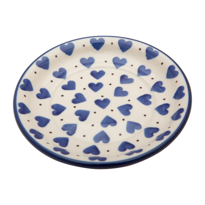 Wzór KLASYCZNY - granatowe serca i drobne kropki w kolorze czerwonym. Wykończenie obrzeża w kolorze granatowym. Ceramika Bolesławiec - HANDMADE.