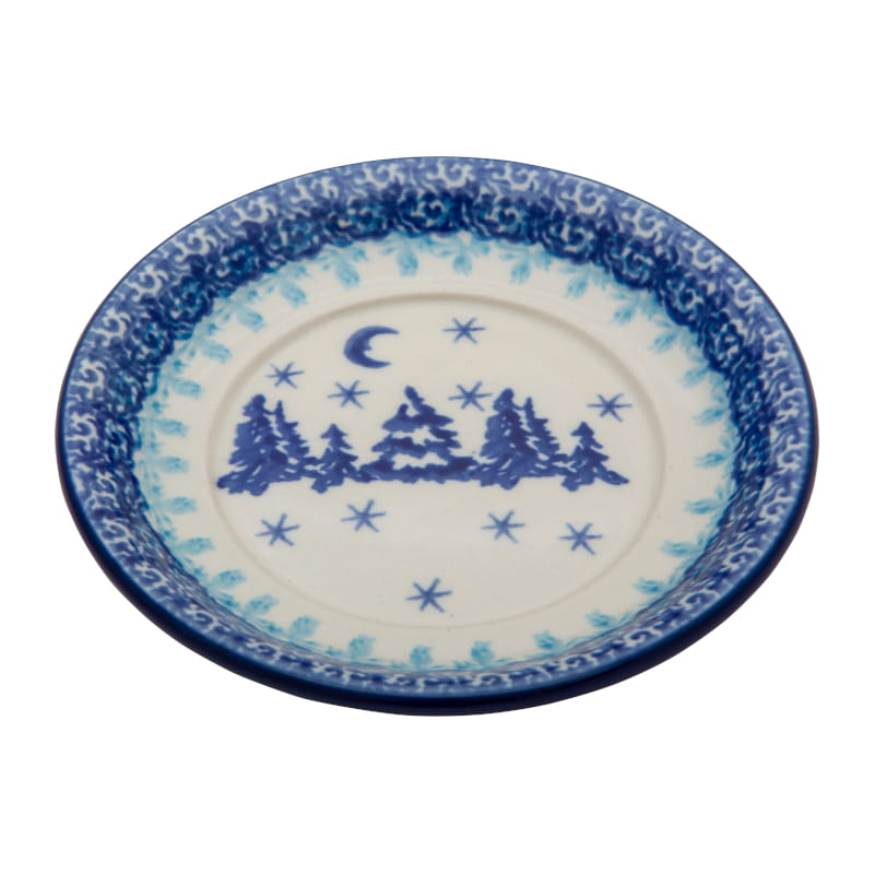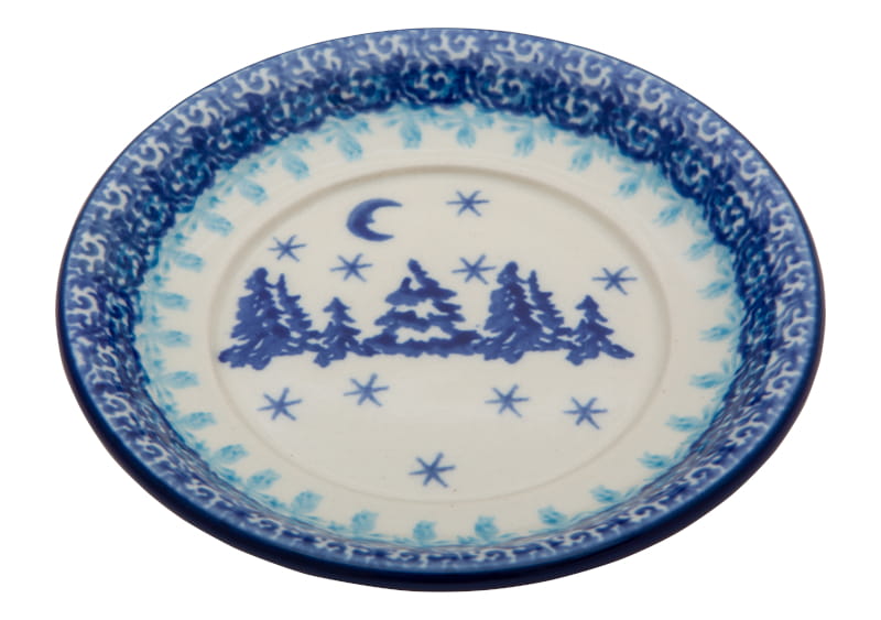 Wzór świąteczny, zimowy z lasem w nocy, przysypanym śniegiem. Ornament wokół. Wzór utrzymany w odcieniach niebieskiego. Wykończenie obrzeża w kolorze granatowym. Ceramika Bolesławiec - HANDMADE.