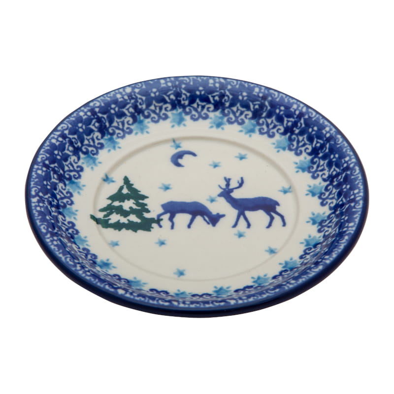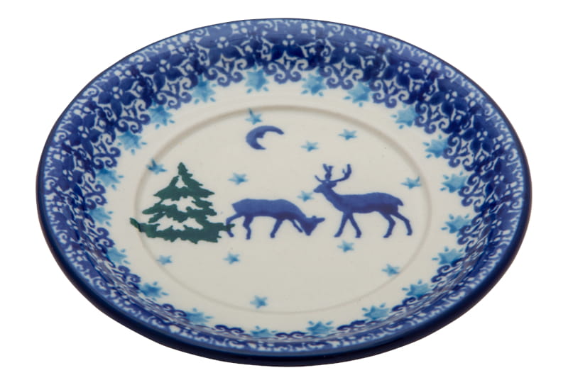 Wzór świąteczny z jeleniami i zimowym krajobrazem w lesie. Świerki, gwiaździste niebo, śnieg. Wykończenie obrzeża w kolorze granatowym. Ceramika Bolesławiec - HANDMADE.