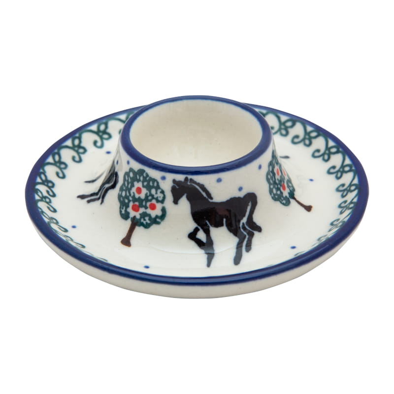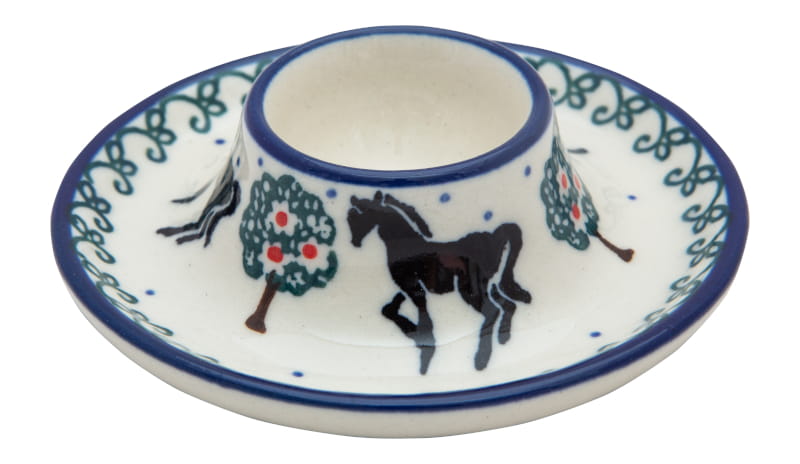 Wzór z motywem konia. Czarny koń i drzewa. Wykończenie obrzeża w kolorze granatowym. Ceramika Bolesławiec - HANDMADE.