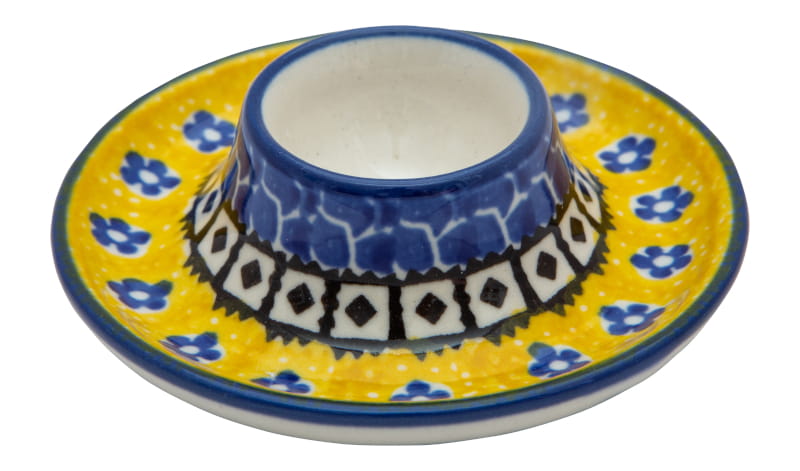 Ceramika Bolesławiec - HANDMADE. Wzór KWIATOWY z tłem kolorze żółtym. Wykończenie obrzeża w kolorze granatowym.