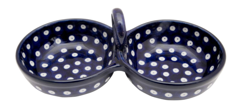 Wzór KLASYCZNY z tłem w kolorze granatowym. Klasyczne kropki Bolesławiec. Wykończenie obrzeża w kolorze granatowym. Ceramika Bolesławiec - handmade.