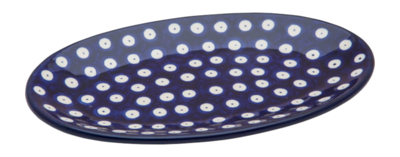 Dekoracja KROPKI Bolesławiec. Wzór KLASYCZNY z tłem w kolorze granatowym. Wykończenie obrzeża w kolorze granatowym. Ceramika Bolesławiec - handmade.