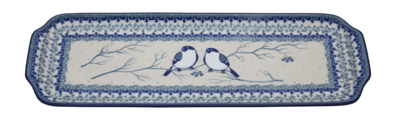 Wzór Unikatowy. Dwa ptaki w kolorach zimy. Wykończenie obrzeża w kolorze granatowym. Ceramika Bolesławiec - HANDMADE.