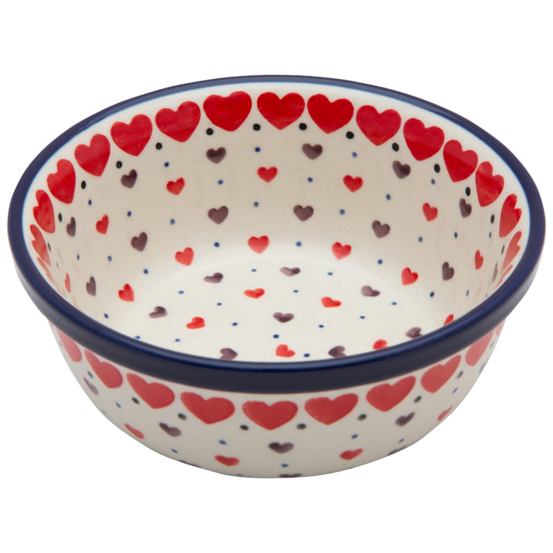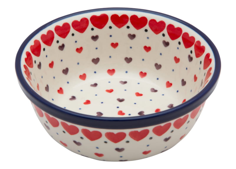 HEART pattern. Red and brown hearts and tiny blue dots. The edge in navy blue. Boleslawiec pottery - handpainted.