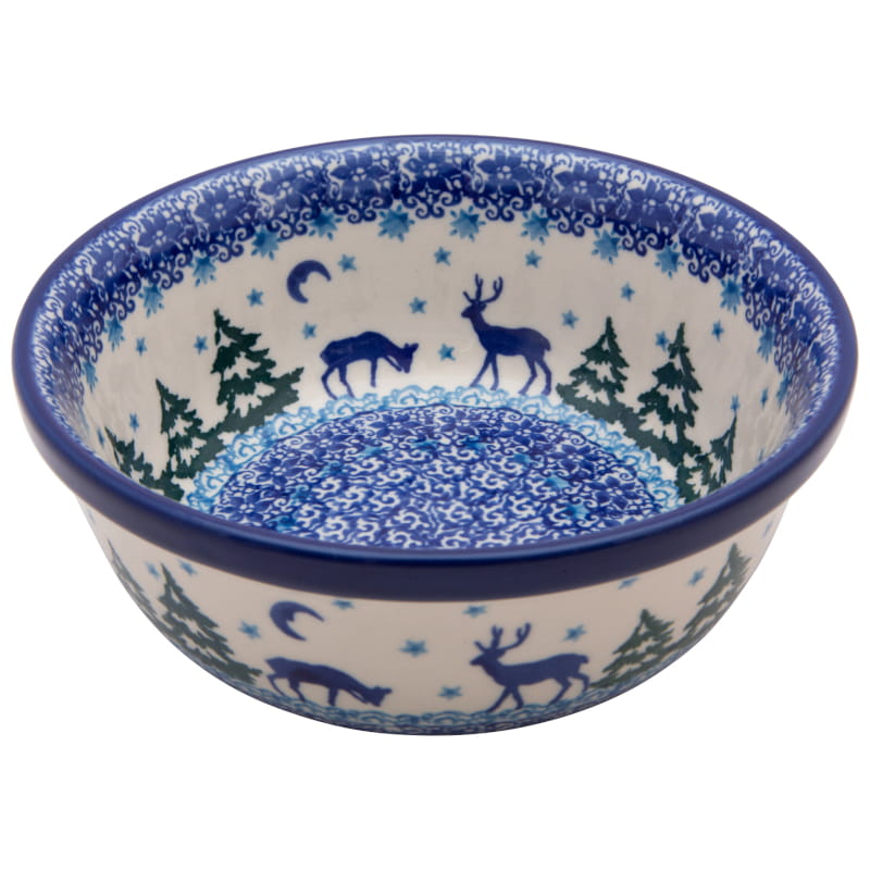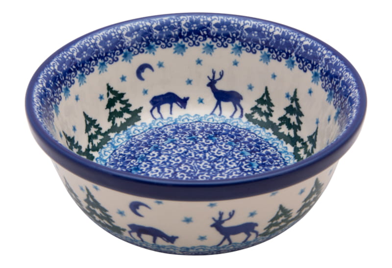 Christmas pattern with deers and winter landscape in the forest. Spruces, starry sky, snow. The edge in navy blue. Boleslawiec pottery - handpainted.