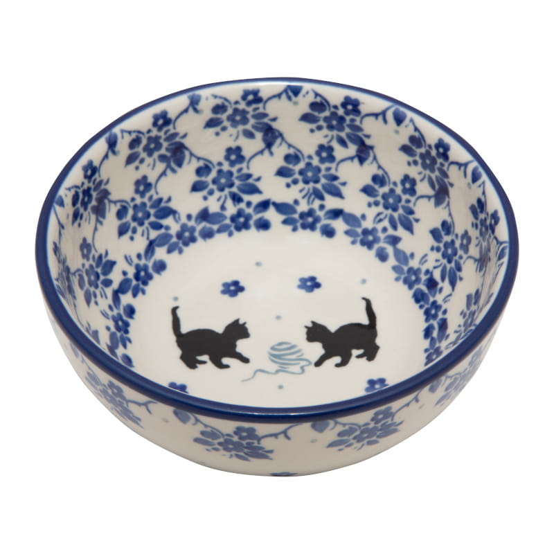 Design with cats in shades of blue and black. Cats playing with a ball of wool surrounded by floral patterns. The edge is finished in navy blue. Boleslawiec pottery - handpainted.