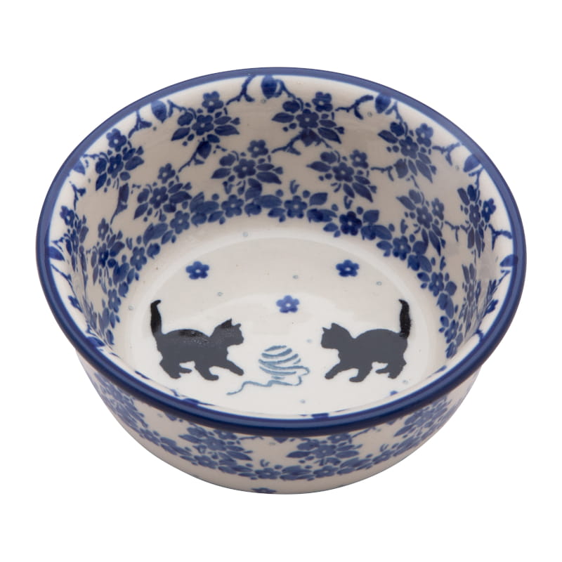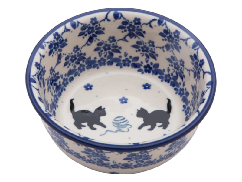 Design with cats in shades of blue and black. Cats playing with a ball of wool surrounded by floral patterns. The edge is finished in navy blue. Boleslawiec pottery - handpainted.