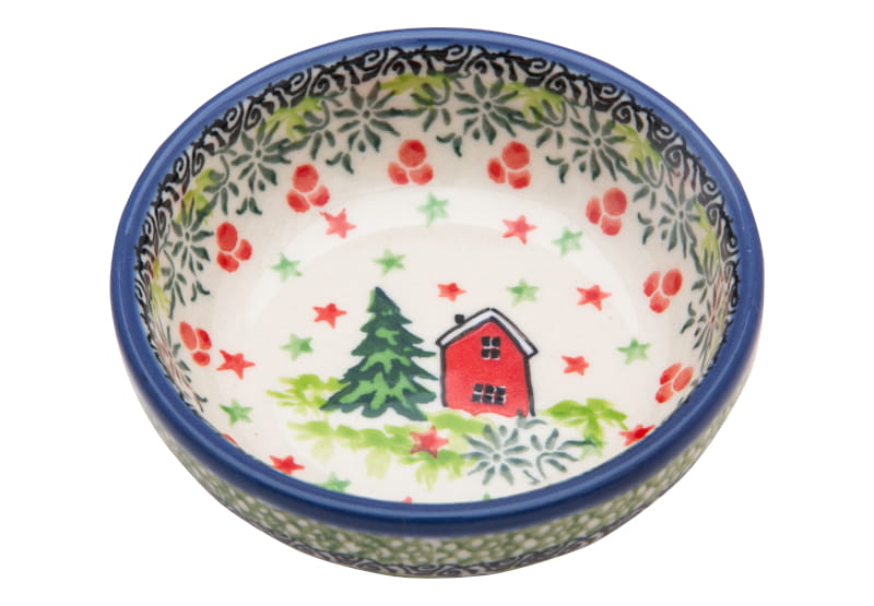UNIQUE pattern. Winter pattern in shades of green and red. Houses, stars and spruces with plant ornaments. The edge in navy blue. Boleslawiec pottery - handpainted.