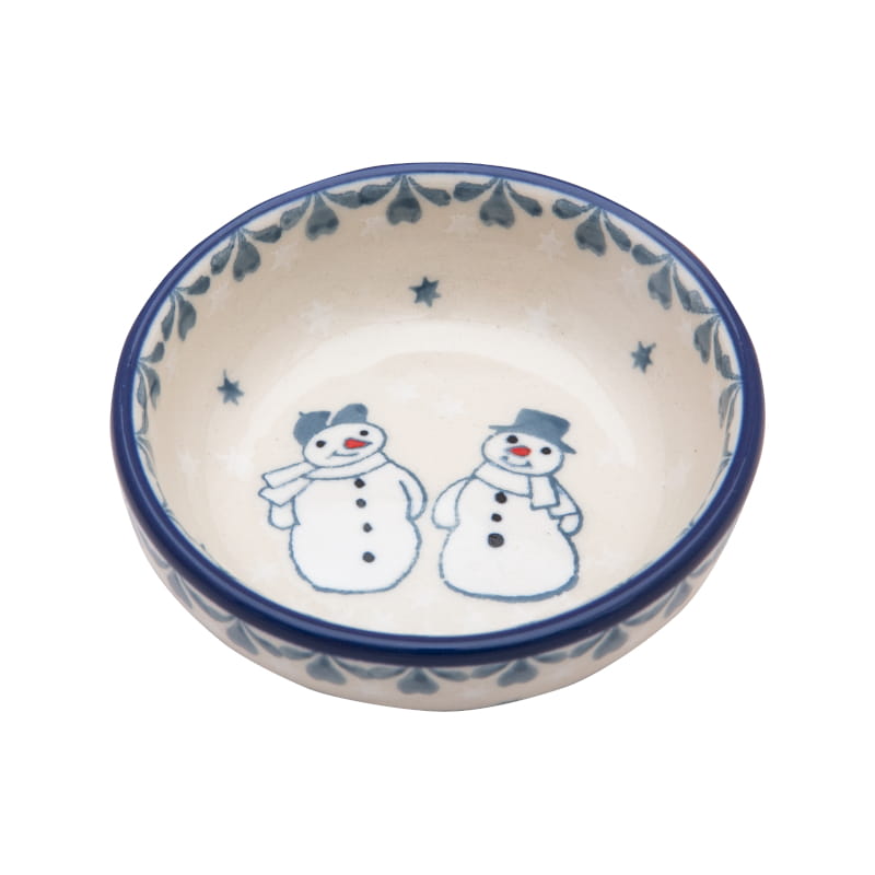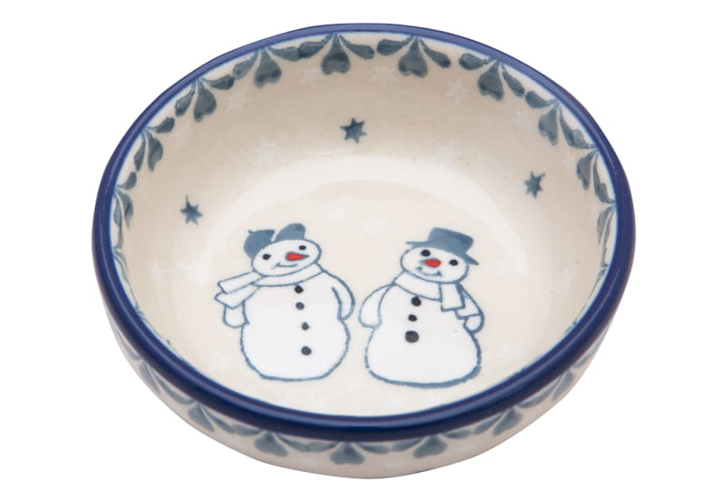 Christmaspattern with snowmen in cap and hat. Light blue and white stars around. The edge in navy blue. Boleslawiec pottery - handpainted.