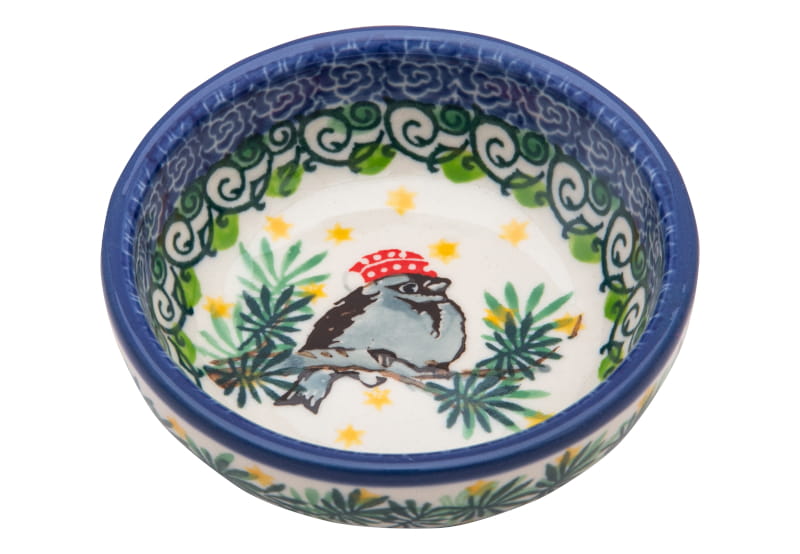 Unique Pattern - black and gray birds (sparrows) in a red winter hat sitting on a branch among the stars. Ash leaves and plant ornament in shades of green and blue. The edge in navy blue. Boleslawiec pottery - handpainted.