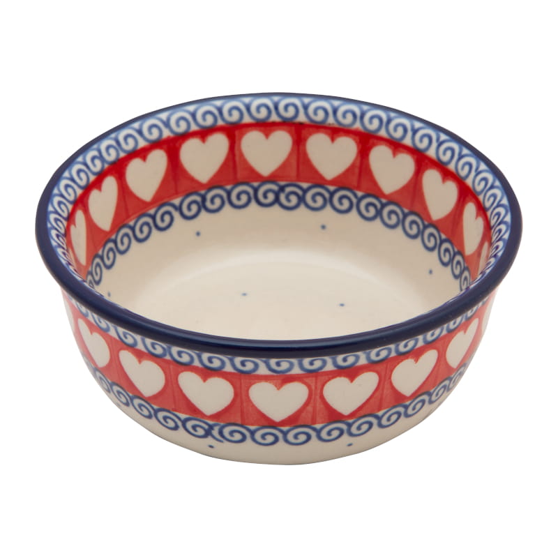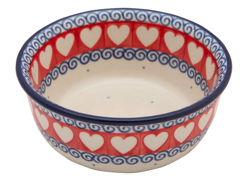 HEART pattern - white hearts on a red background and navy blue spirals. The edge in navy blue. Boleslawiec pottery - handpainted.