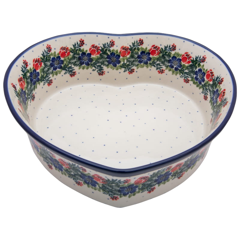 Pattern with tulips . Red betwwen blue. Delicate, ornamental green and blue floral motif around. The edge is finished in navy blue. Boleslawiec pottery - handpainted.