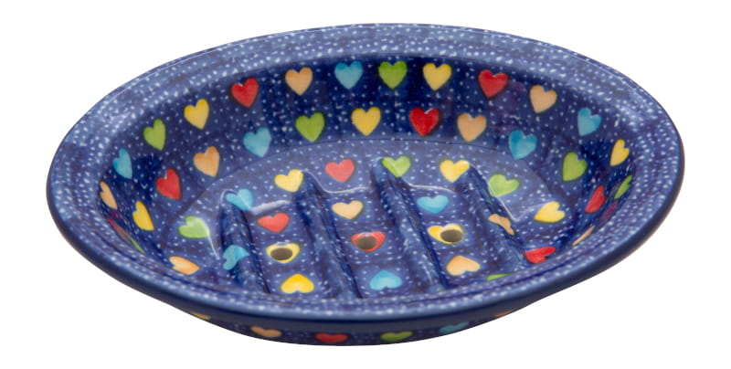 UNIQUE pattern - Heart pattern. Multicolored hearts on a navy blue background. The edge in navy blue. Boleslawiec pottery - handpainted.