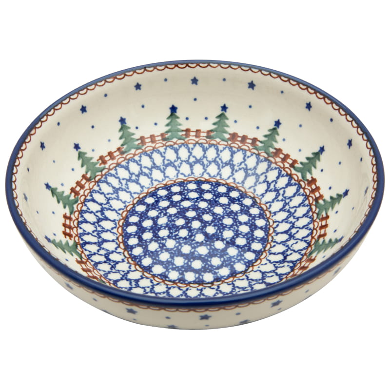 Christmas pattern in vintage style in blue and brown colors with a Christmas tree, stars and snow. Geometric circle pattern and brown fence. The edge in navy blue. Boleslawiec pottery - handpainted.