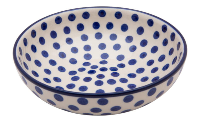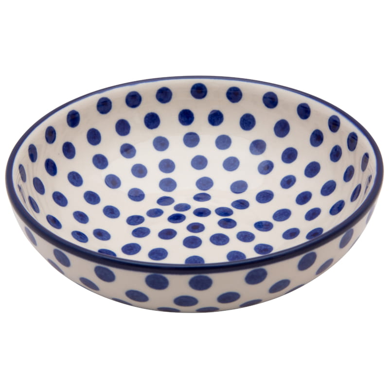 Classic pattern in a vintage style - navy blue dots on a white background. The edge in navy blue. Boleslawiec pottery - handpainted.